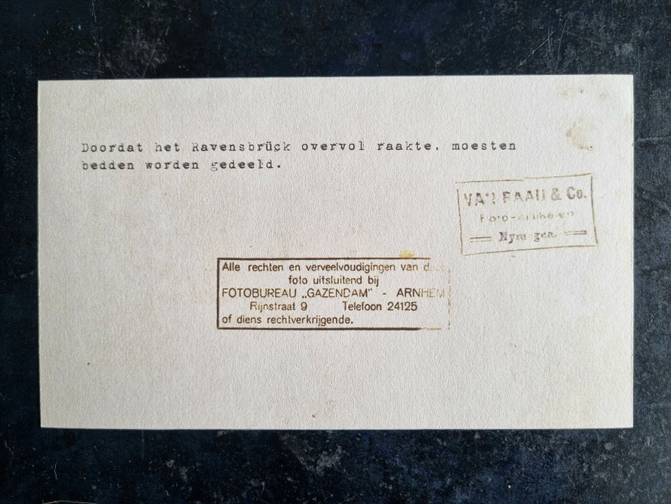 Op de achterzijde staat een kort, getypt bericht: 'Doordat het Ravensbrück overvol raakte, moesten bedden worden gedeeld.' Die toelichting biedt waardevolle historische context en is zelf een document uit de Tweede Wereldoorlog. Daaronder vinden we twee inktstempels: – VAN FAAM & Co., Foto-uitgaven Nijmegen – FOTOBUREAU 'GAZENDAM' ARNHEM, Fijnstraat 9, Telefoon 24125.