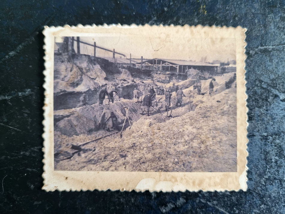 Deze sepia-getinte zilvergelatineprint met gekartelde rand, vermoedelijk afgedrukt rond 1940–1945, legt een moment vast uit kamp Ravensbrück, het beruchte vrouwenconcentratiekamp van de SS. De afmetingen van ca. 9×7 cm en de kartelrand wijzen op een consumentenvormig labowerk. Op de foto zien we vrouwelijke gevangenen aan het werk. Achter hen rijst een houten constructie op, mogelijk puin van een beschadigd barakgebouw of nieuwe steunbalken. De oneffen, modderige grond illustreert het zware werk dat gedwongen werd onder soms brute omstandigheden.