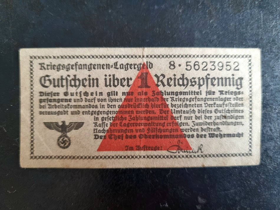 Tijdens de Tweede Wereldoorlog voerde het Duitse leger een eigen vorm van betaalmiddel in voor gebruik binnen krijgsgevangenenkampen: het Kriegsgefangenen-Lagergeld. Het biljet dat hier wordt getoond, vertegenwoordigt een waarde van 1 Reichspfennig en werd uitsluitend gebruikt door geallieerde krijgsgevangenen in kampen zoals Stalags (voor soldaten), Oflags (voor officieren) en bijbehorende Arbeitskommandos. Dit interne kampgeld was niet bedoeld voor gebruik buiten het kamp en kon niet worden ingewisseld voor regulier geld. Het was een instrument van het Oberkommando der Wehrmacht om economische controle te behouden en contact met de burgerbevolking te beperken.